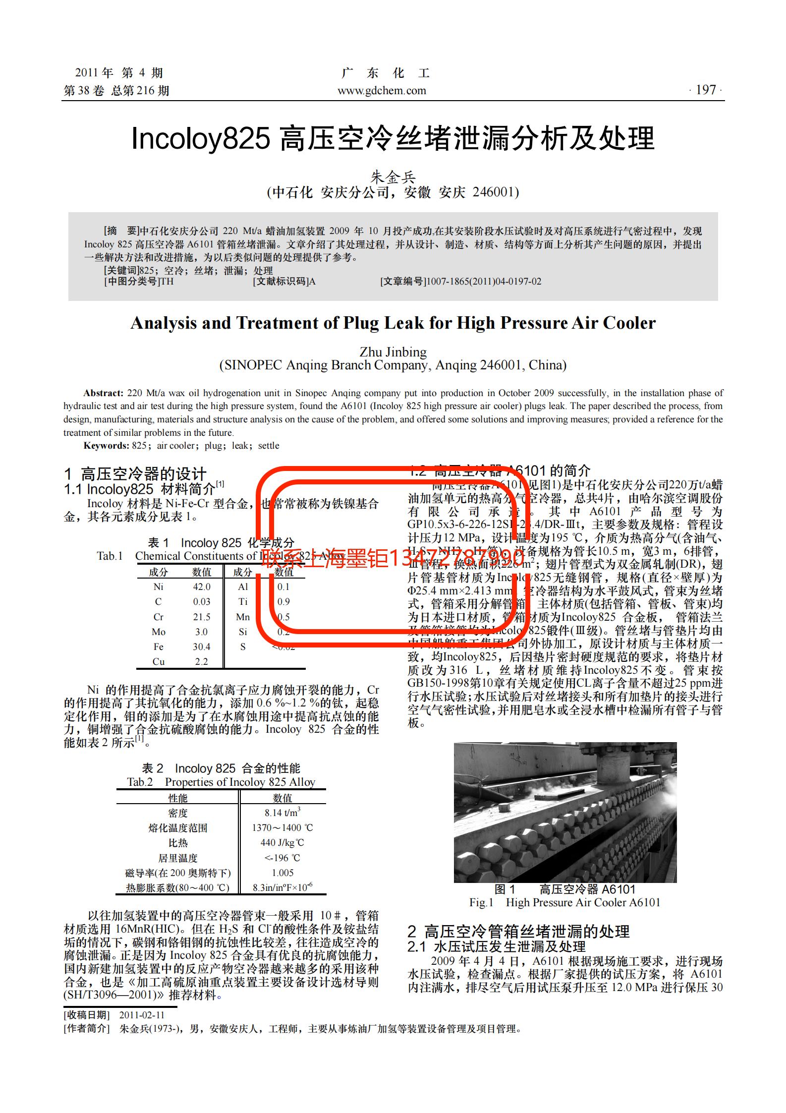 技術文章 Incoloy825高壓空冷絲堵泄漏分析及處理 更新時間 2021-07-13 06:46:16 閱讀 908 上一篇:INCOLOY825多波厚壁波紋管壓制過程 下一篇:空冷器管束用Incoloy 825復合鋼板設計厚度的探討